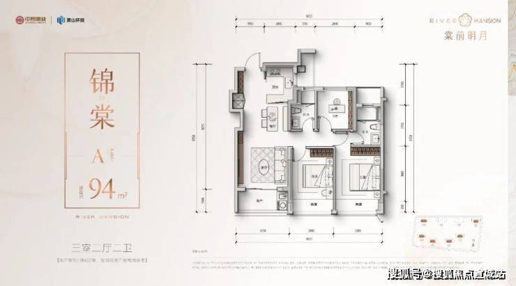 - 94㎡三房:三开间朝南,南向面宽近10米,1.5米进深阳台,独创“S墙”嵌入双开门冰箱。