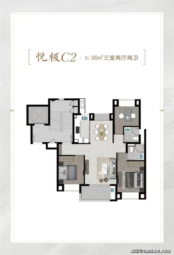洋房:有 88-99㎡三房两厅两卫、105㎡三房两厅两卫等户型。88-99㎡户型三开间朝南,3.6 米客厅面宽,7㎡观景阳台;105㎡户型 3.8 米客厅面宽,独立餐厅,主卧套间面积达 16㎡。