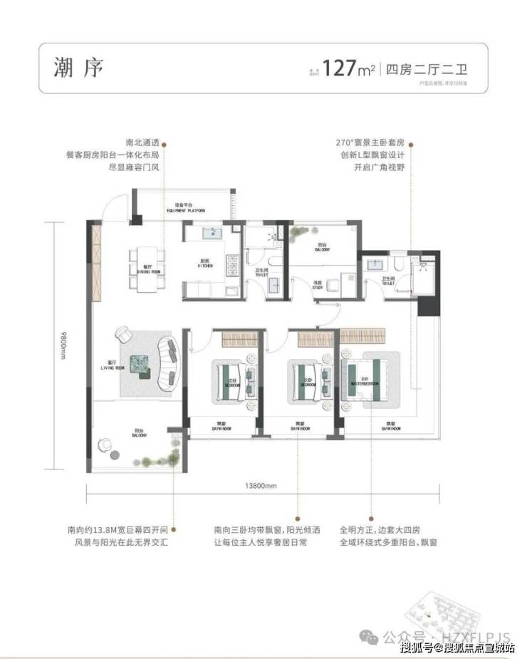 揽景小高层建筑面积约105-130㎡,为最大化景观面,突破性设计建筑面积约105㎡南向四开间。