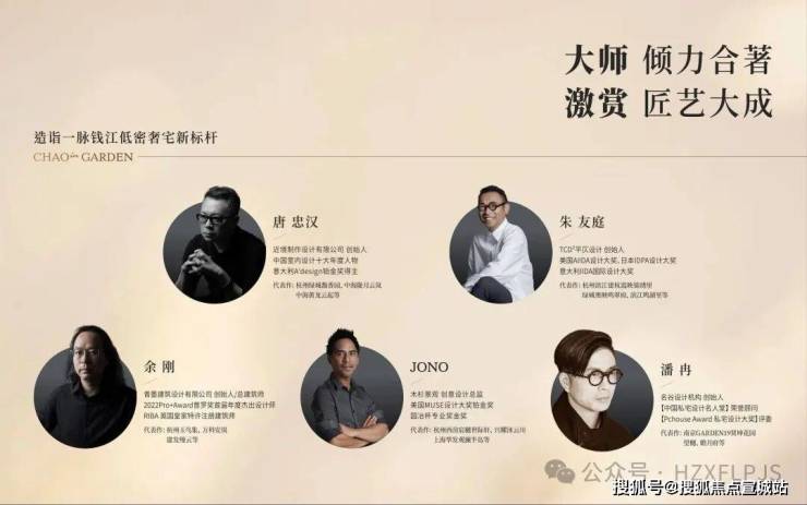 力邀近境制作创始人 唐忠汉、TCD²平仄设计创始人 朱友庭、木杉景观创意总监 JONO、名谷设计创始人 潘冉、青墨建筑设计创始人 余刚5位设计名家重磅携手。集匠艺之大成,共筑金沙湖当代奢宅新标杆。