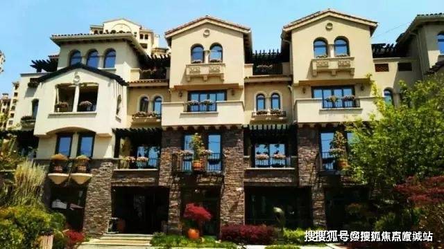 外立面采用文化石和手工打磨的stucco艺术涂料,烟囱、山花、铁艺栏杆、木质葡萄架,配合高低错落的彩瓦屋顶,空间层次优美。