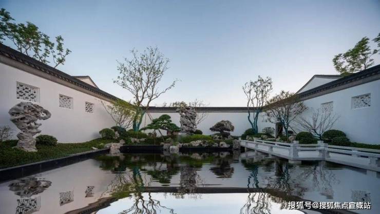 园内设置七处景观组团,以中国各大古典名园为借鉴,并融入宋代的雅致生活韵味。宋式园林更强调“精而造疏,简而意足”,擅以意山水画为蓝本、以画设景,诗词为主题。步履其中,移步换景,步步生趣。花园组团规模扩大,户户有景,各自成趣,或临廊听雨,或观亭赏风,居住更为诗意。