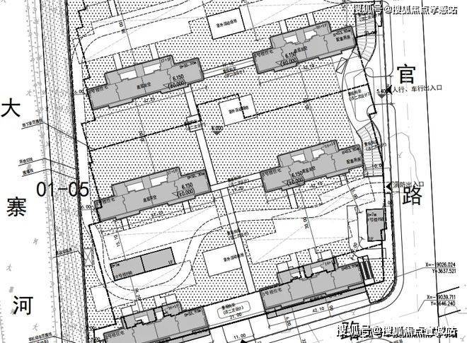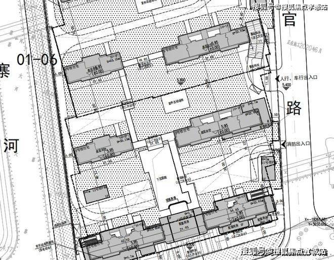 01-03(中间),规划10幢楼,其中一幢为保障房,总高17-18-20层,小区中心位置的商品一楼为架空层,南北楼间距30米.