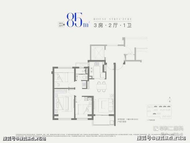 85㎡三房一卫(二/三期):总价320万起,两梯四户(有连廊),户型方正全明,南北通透,三开间朝南+短进深,采光通风俱佳,适配新婚家庭或三口之家。