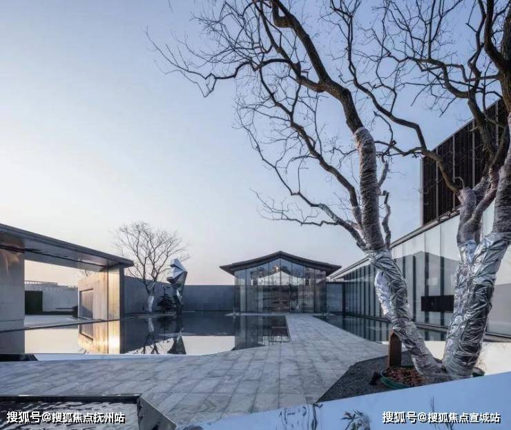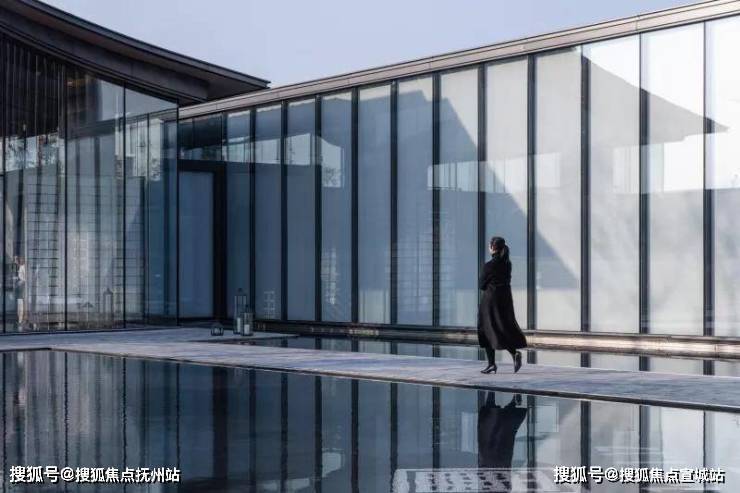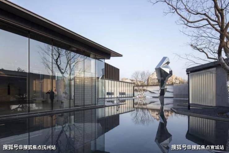 穿过大型玻璃构筑,走进前场。门楼前开阔的广场,昭示了元垄·华著“现代化、城市化”高端楼盘的定位。穿过西周直江上的景桥,即可看见景观水帘,水流淅淅沥沥地流淌,灵动悦耳,与简约的门楼相互映衬。踏上台阶,超大水面映入眼帘,水中倒映着简约现代、充满绍兴特色的销售中心建筑。