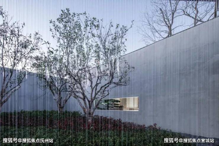 景观门楼既是入口,也是前场的景观连廊。步入连廊,一面内置水乡特色山水绢画的U玻景墙展现在人们面前,水墨韵味满盈。