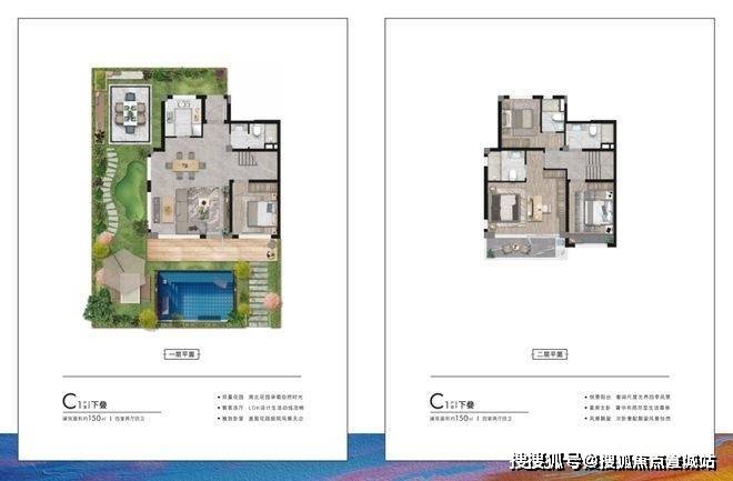 来看户型,面积段有两种——建面约95㎡下叠、上叠;建面约150㎡下叠、上叠
