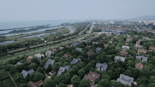 整个项目还和小区外的太湖水景、河道景观以及绿色植被进行有机融合,你会发现小区和外界的边界感也消弭了,从天空俯瞰,非常唯美,甚至有种仙境的既视感。