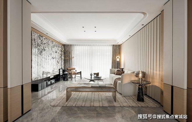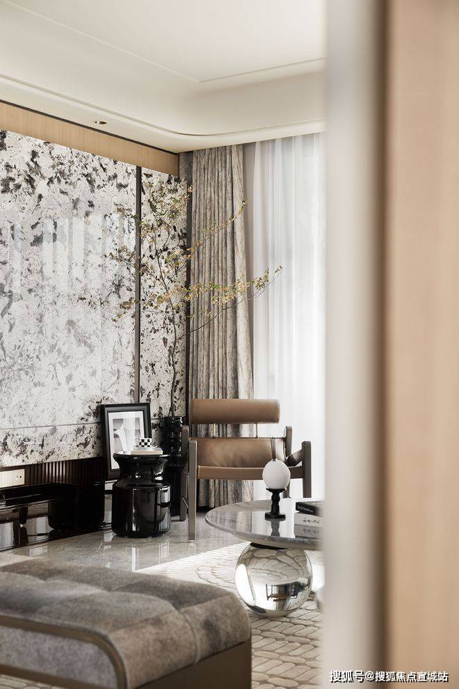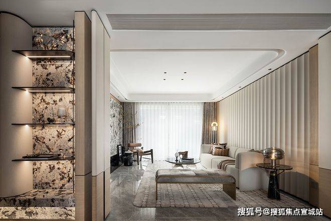 设计的主题元素来自于富春江水的气韵与形态,整体以素雅色调为主,儒雅,淡然。天然奢石“雪山飞狐”的运用,增添艺术氛围的同时,也使得视觉更具层次。