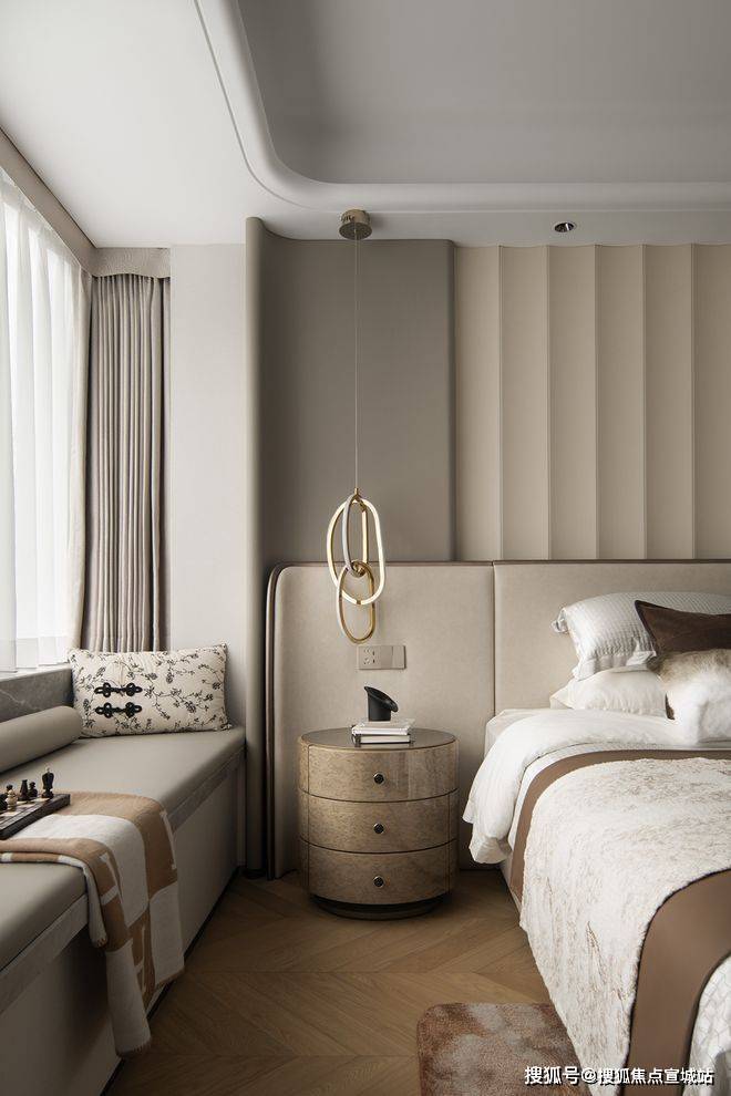 次卧的色调稍暗,在不同材质的线条下,显得安宁而祥和。