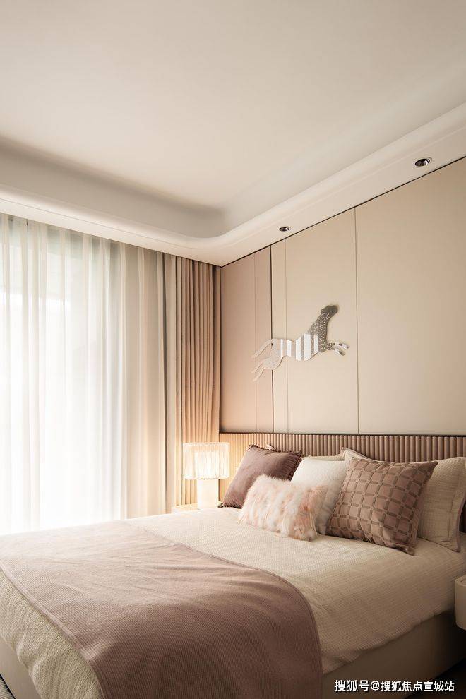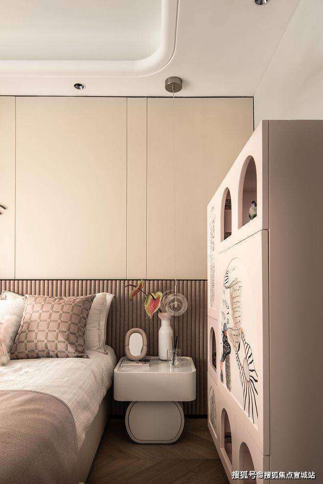 次卧与儿童房更倾向于温馨与舒怡。女孩房采用淡雅的灰粉色,材质柔软,形式圆润,细节的装饰充满童趣。