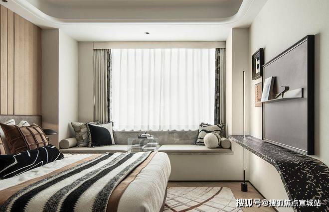 主卧聚焦居住者心里层面的私密感受。将不必要的元素剔除,留下简柔色块,柔和的光线和质感细腻的材质,使整个卧室显得温馨而舒适。床前的绿植和窗边的阅读角,为居住者提供了一个放松心灵的角落。