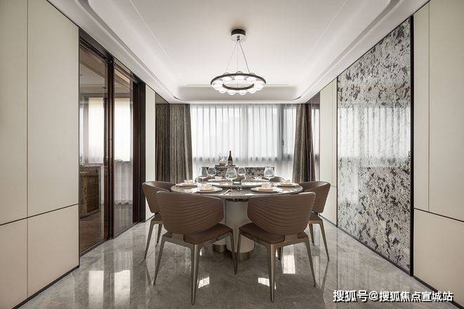 厨房玻璃平推门的半开放式设计,开合之中,是独立操作和共同享乐间的情绪转化。细节上,边台和墙面局部延续水墨纹理石材的语境,维持了家居色调统一。