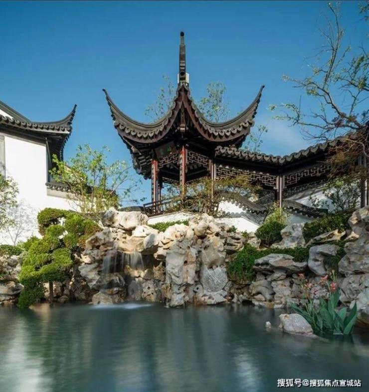 中式园林是最纯粹最理想的精神皈依之所。 进入园林庭院,古朴有致, 瘦漏透皱的太湖石下一方清泉涵韵其间,低头有池水如镜,抬头有瀑布如练,“ 水积必然龙有穴 ”,富贵因子已然埋藏于此。