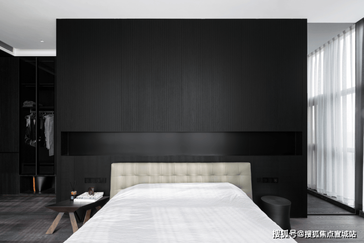 空间是光影的容器,自然光穿透白色的纱帘给会客厅加了一层摩登的滤镜。两侧纱帘光影通透,暗香浮动,几丝波影乍如烟。一处吧台,临烟火,酌清欢。烟火清欢,一半一半。