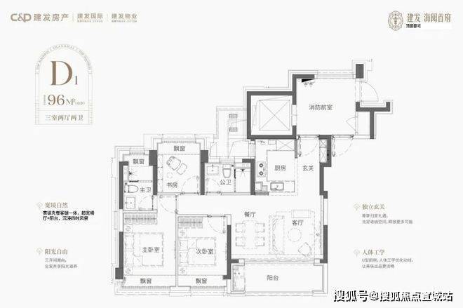 建发海阅首府售楼处电话:400-8123-224另一套建面约100㎡飞机户型,同样做了三房两卫,户型方正,几乎无过道设计,每一寸空间都没有浪费,舒适不局促。