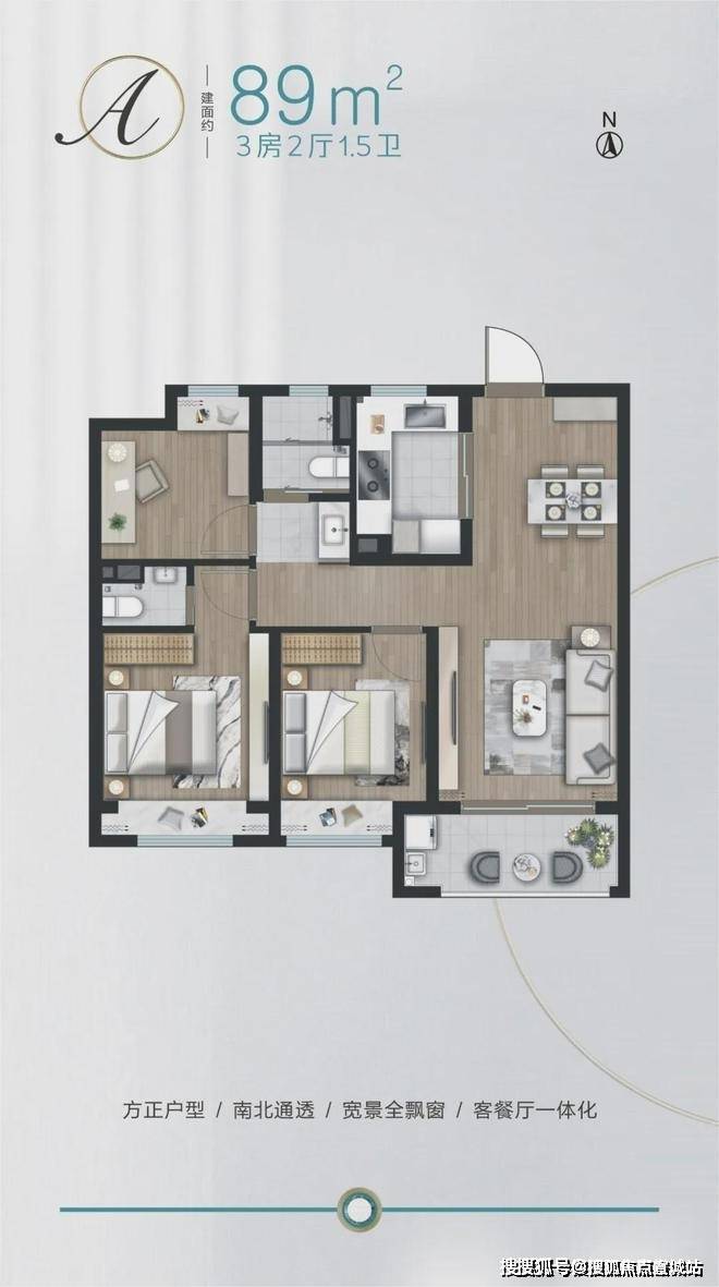 建面约89㎡做3房,功能性上就占尽先机,没想到项目还有1.5卫配置,主卧升级套房,真正实现一步到位!