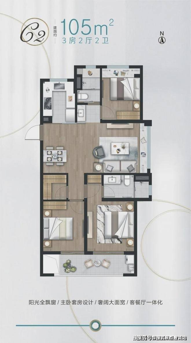 建面约105㎡3房,餐客大横厅设计,与南面阔景阳台相连,采光通风良好。全卧飘窗,主卧套房设计,提升了居住舒适度。U型厨房,动线流畅。