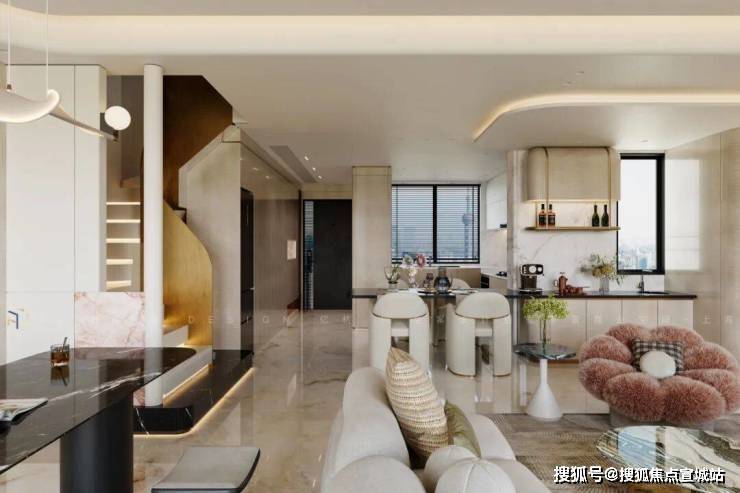 客餐厅一体化 :客餐厅相连,空间开阔,可容纳 3-4 人用餐、休闲,连接阳台,引入充足阳光与景观;