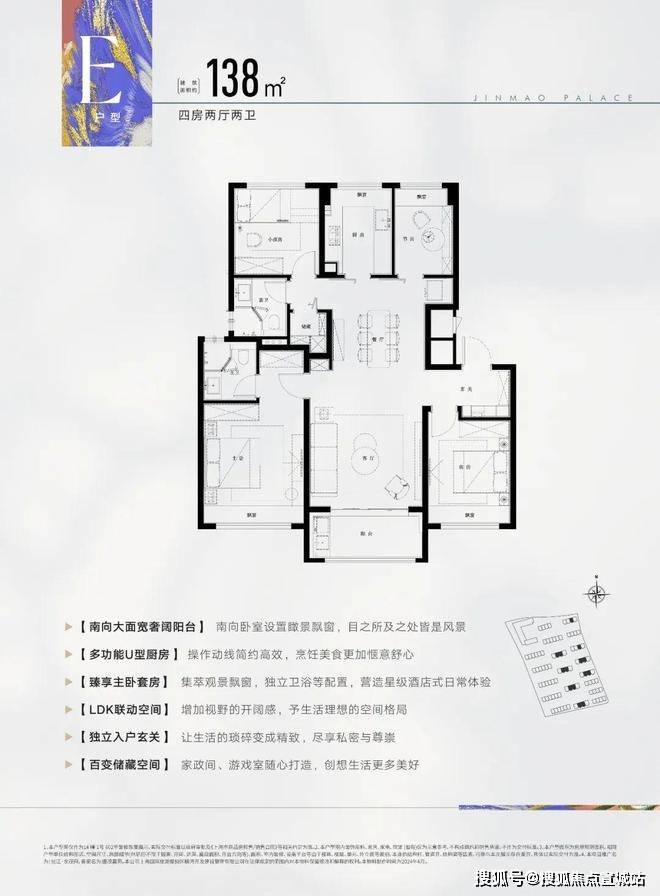 张江金茂府售楼处预约电话:400-8862-334此户型为飞机户型,可以说是改善人群非常喜欢的户型,建面约138㎡4房2厅2卫设计,动静分区,三开间朝南,各空间尺度奢阔,还有一个大面宽景观阳台,实现功能性和舒适度兼得。张江金茂府售楼处预约电话:400-8862-334