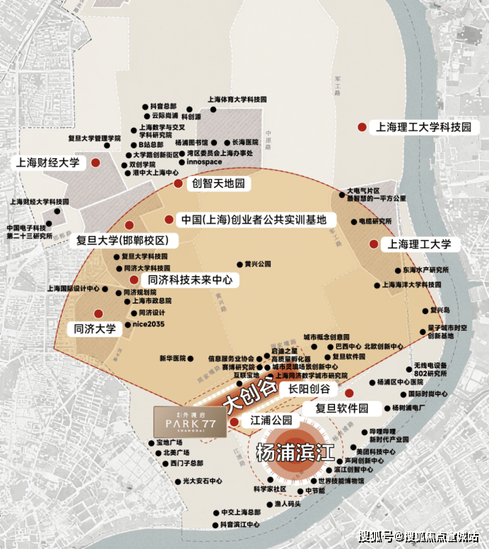 同时,保利外滩启PARK77独据杨浦滨江科创扇面启点(江浦公园站),5km创新半径内,无论高校资源富集度、产业创新浓度,还是人才密度皆为上海更高:百年复旦、巍峨同济、上海理工3大顶尖高校,在此如群星汇聚;7家国家大学科技园、100余所科研机构、1200多家国家高新技术企业,在此星罗棋布,数量位居上海全市前列;国家级创新引擎——长阳创谷,集聚小红书、得物、福特汽车、同济数字研究院等巨头,百度创新中心、埃森哲AI实验室、赢彻科技等人工智能企业;大连路总部研发集聚区,吸引了西门子、大陆集团、李尔亚太等近1700家企业入驻。