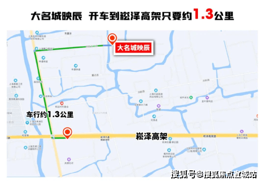 从大名城映辰行驶到崧泽高架赵重公路出入口只要约1.3公里,上了高架没有红绿灯直通大虹桥核心。