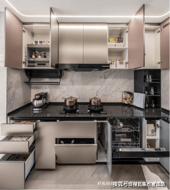 建发海宸巧妙利用空间拓展、功能分配、动线设置、超能收纳等实现了好厨房的“1步法则”,将操作步骤调配到舒适距离,让男女主人爱上下厨。