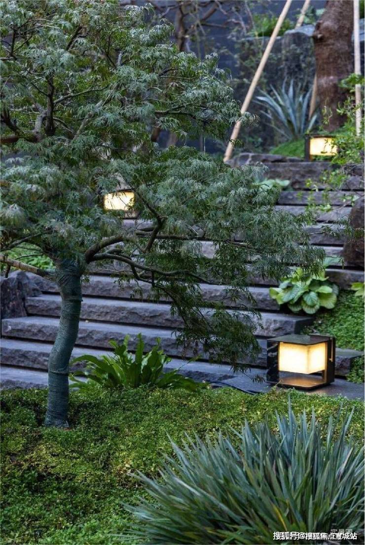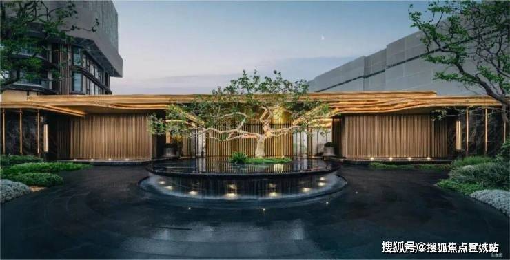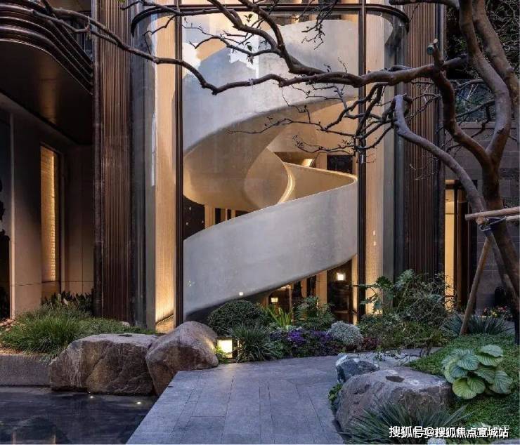 而实景首开的近2000㎡下沉庭院,作为“园林灵魂”,漫步此间,你会看见:乌金原石围合的“玉扣绿岛”上,低调静放着团队自“天下玉源”河南南阳历时遴选而来,近7000年的“国玉”独山璞玉,与山野林木共此氤氲灵气,尽显东方温润;从诗经走出来的近11m高参天乌桕,则再现古诗中所描述的“秋林城郭画图中,乌桕千株照眼红“的诗意;采用约6.7m幻影蓝奢石打造的“叠级水瀑”跌水台,池底以呈现天然墨绿色泽的蓝金刚石铺就,映水之澄明,境之悠远;连台阶都采用了“黑色花岗岩之王”安哥拉黑整石,沿云梯而上,让人返璞内心东方......