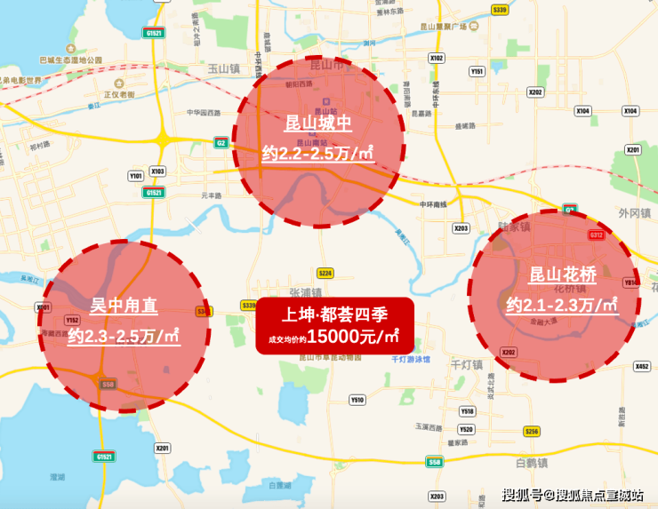 交通配套:邻近规划中的地铁 K1 线,距离京沪高速昆山出入口约 5.5 公里,可快速通达苏州园区和上海虹桥。