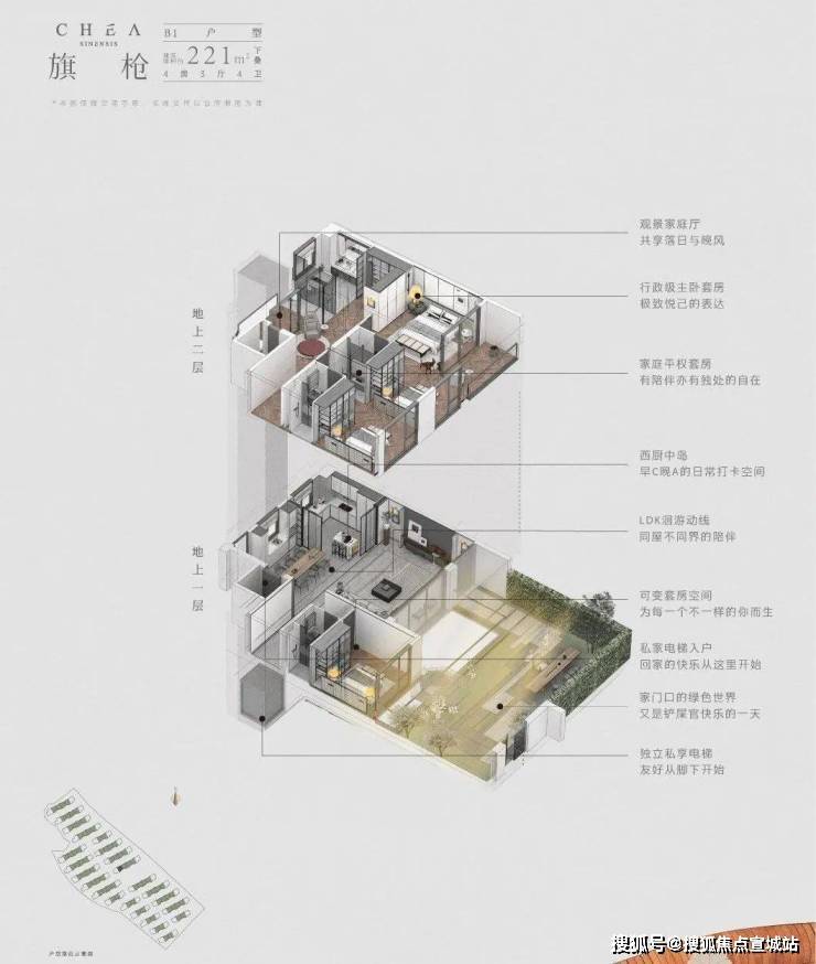 以 中间套下叠“旗枪”户型 为例,利用地势高差 做了下沉式庭院 ,由于是坡地地形,所以即便是地下空间,也有大面采光; 二楼则设计了挑出露台 ,拥有大面积室外空间。