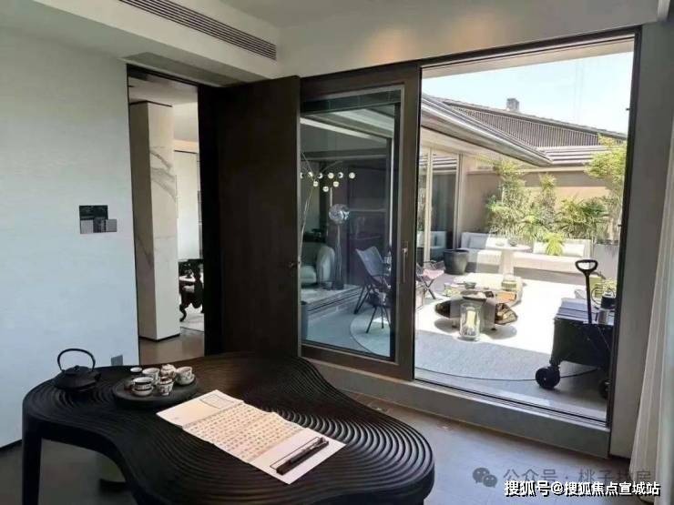 这座水庭也是一整面「水镜」,将中心的乌桕树、周围的超大白玻、精致的艺术雕塑都倒映其中。