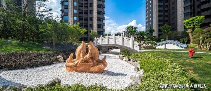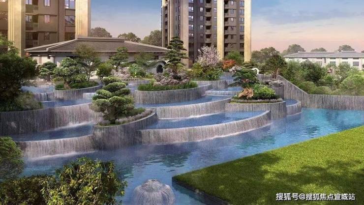 小区内部的新中式山水园林设计与城市绿化自然过渡,设置众多艺术雕塑、景观休闲步道、中央景观层叠式水瀑布等,形成浑然天成的园林景观。