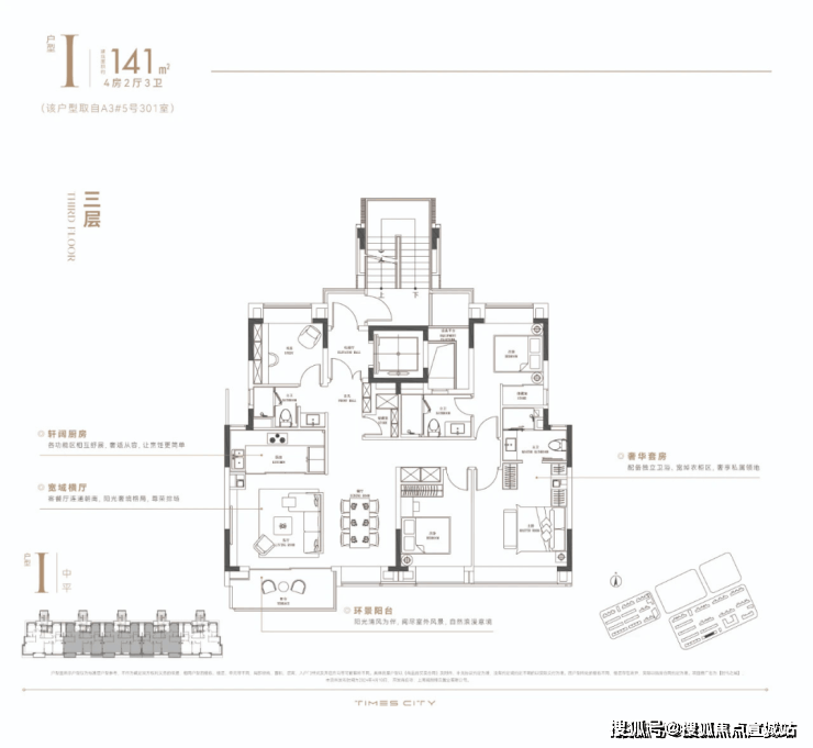 中平户型以四开间朝南的IMAX级采光面,打造出堪比市区豪宅的尺度感。4房4飘窗2阳台的设计,配合双套房布局,一共有三个套房,让每个家庭成员都享有独立私密空间。