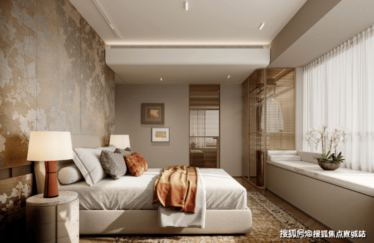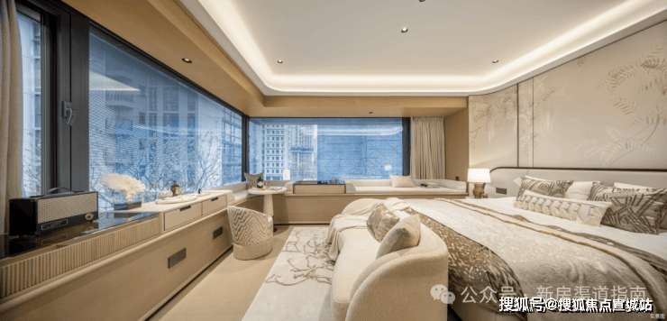 主卧拥有270度环幕飘窗,视野和采光优越,配备了高奢卫生间,空间感、尊崇感拉到顶格。