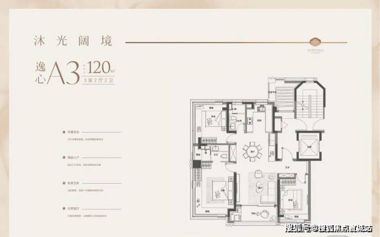 户型特点:边套户型,3开间朝南,方正格局。客餐厅一体化设计,餐厅空间宽敞,客厅进深较短但可通过与阳台连通优化空间感。全屋飘窗设计,边套南北卧室为270°转角飘窗,采光充足。独立电梯厅约7-8㎡,可改造为玄关或收纳空间。