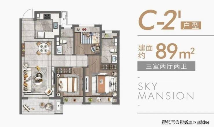 上海宝山天铂建面约83~89㎡朗阔三居全能户型,动静分离,静谧舒适,每1cm的考究,都映射着每一个人居的诉求