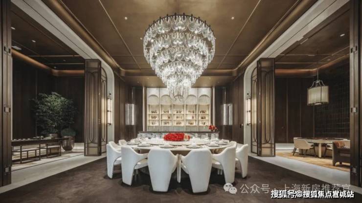 奢享私宴厅,内设巨形艺术水晶吊灯, 还有由整块香格里拉绿奢石一体打磨而成的吧台、白水晶奢石酒架、全景开放式落地窗……优雅格调跃然呈现。女王茶室可对外全部打开,宛若置身绿意和流水中,是闺蜜品茗小憩、私密洽谈的理想私属领地。