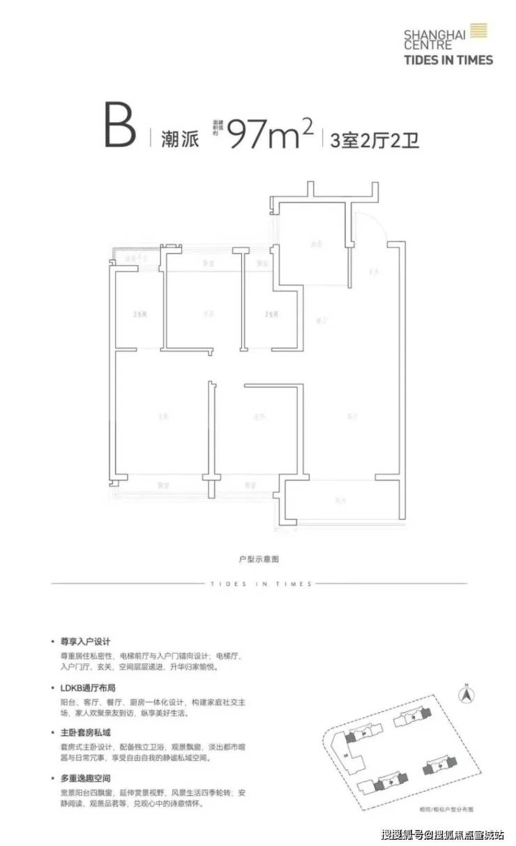 建面约95-97㎡3房2卫,户型3开间朝南+T字动线+动静分离,主卧也设计了套房,让室内采光、通风、私密性都做了进一步升级。