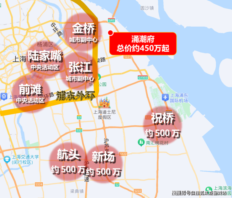 整个浦东外环旁区域的新房价格如下,三林约10万+、周浦约6万+、康桥约6万+、唐镇约7万+,也就是说「涌潮府」足以匹配约600-1000万级才有的地段价值。