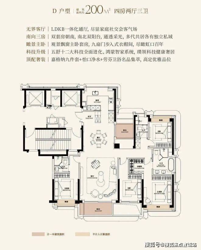 200㎡四房两厅三卫(终极改善):四开间朝南,270° 环幕视野,南北双阳台,主卧套房带双衣帽间 + 书房,独立家政间,适合三代同堂