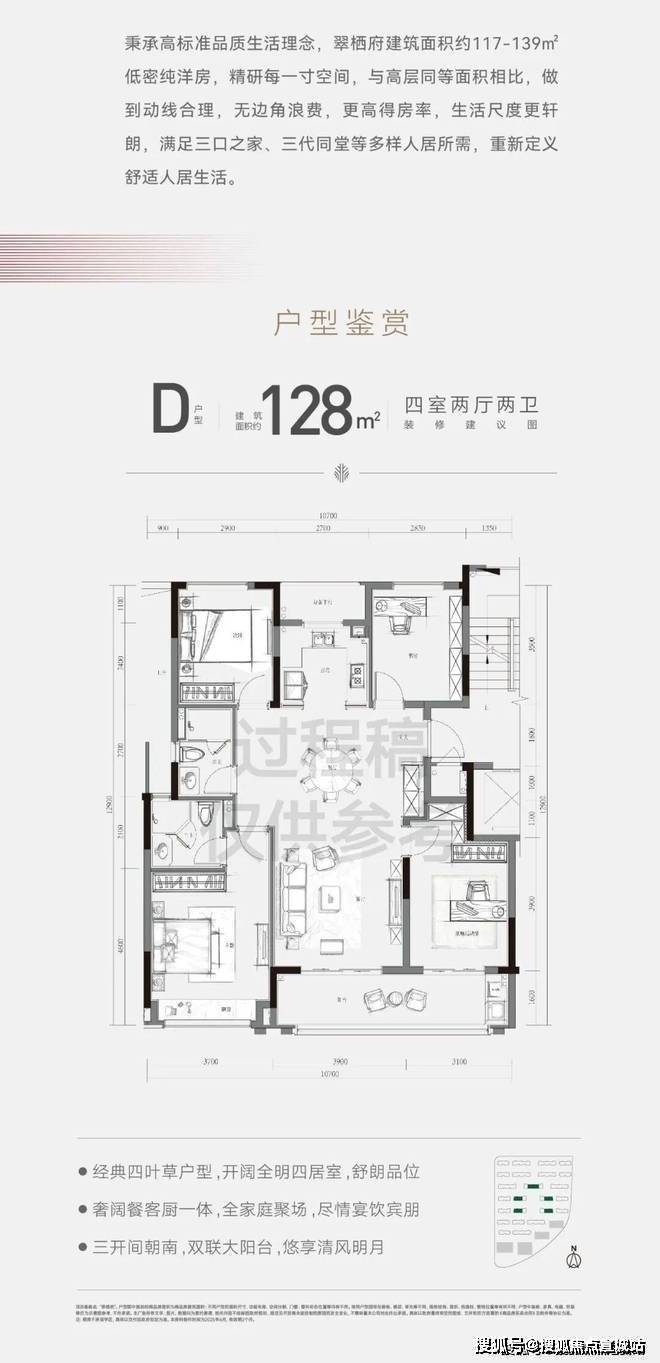 建面约128方采用了深受市场认可的经典的四叶草格局!这种户型的显著特点,就是消灭过道。客厅居于房子的中心,可以直接到达卧室、书房、厨房等各个空间。另外,4个功能间居于四角