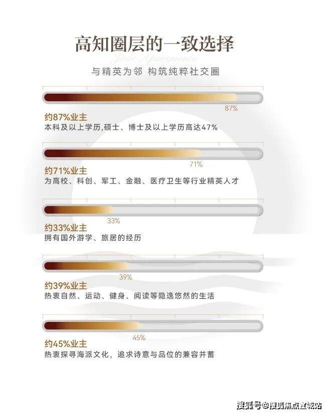 据统计,映江润府业主 约87%为本科及以上学历,硕士、博士及以上学历高达47%! 千金买房,万金买邻,像映江润府这样高比例的高知住区全市少有,而对于年轻的城市菁英们来说,无形的圈层代表着对社会资源的占有,决定着人生的高度。