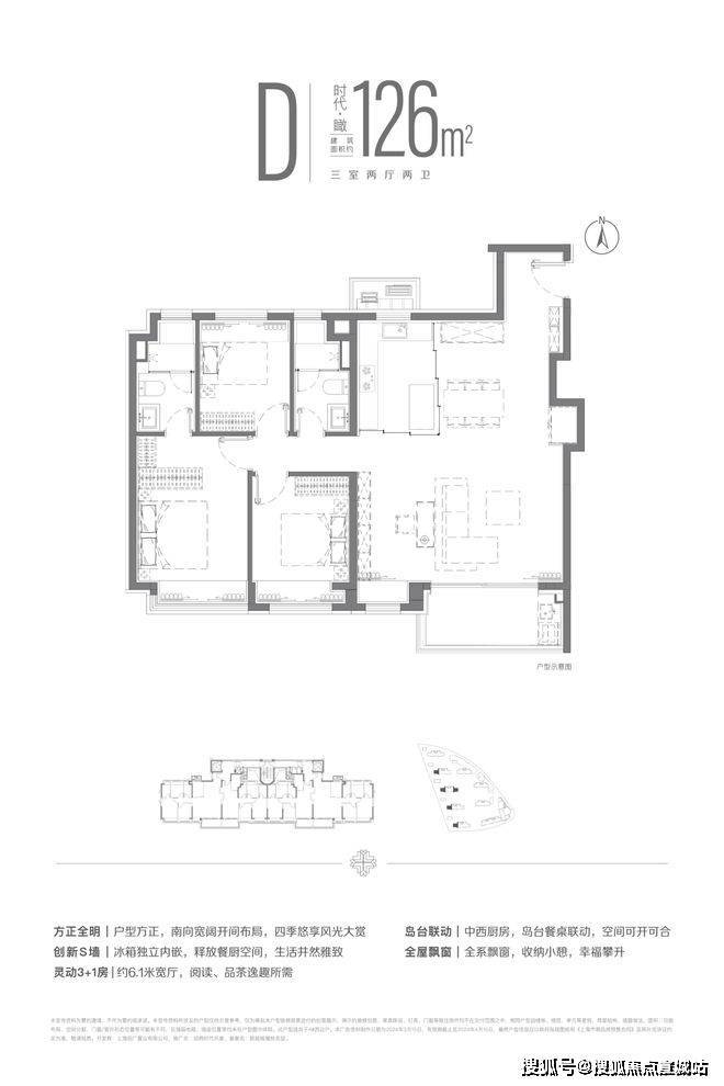 建面约126m²三房两厅两卫户型,南向3+1面宽横厅设计,让空间更加随心而变。主卧双台盆配置,用空间拥抱自然中的无限自在。