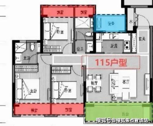 高层115平米:三房两厅两卫大开间短进深,5.8米大面宽观景横厅,干湿分离卫生间,板块同面积段唯一四开间朝南设计