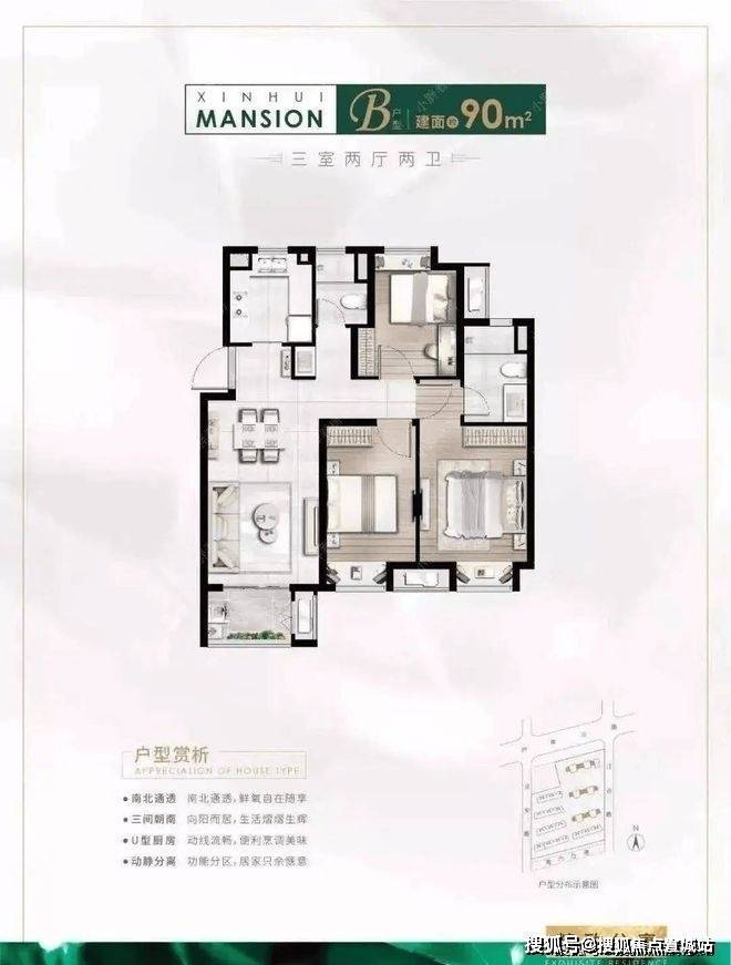 建面约94㎡3房2厅2卫户型特点:做到了三开间朝南+主卧套房设计+全卧飘窗+动静分离+卫生间干湿分离,功能性与空间感完美结合的3房“神户型”.