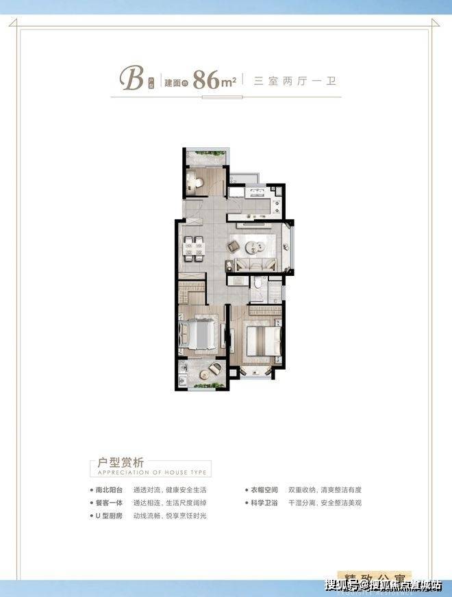 建面约86㎡3房2厅1卫户型特点:做到了双开间朝南+双阳台设计+卫生间干湿分离,一个非常紧凑的小3房户型.