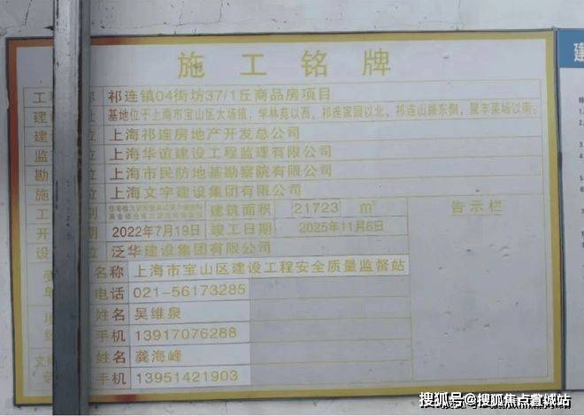施工铭牌显示,该项目竣工日期为2025年11月,建设单位为上海祁连房地产开发总公司。