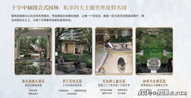 ◎约5000m²十字中轴私享园林:美国比弗利山庄一号为设计蓝本延续城市度假风格,以十字轴线延展,构筑中庭景观泛会所、主题花园等四大主题美境,聚焦全龄成长陪伴,在艺术美境中礼遇美好生活