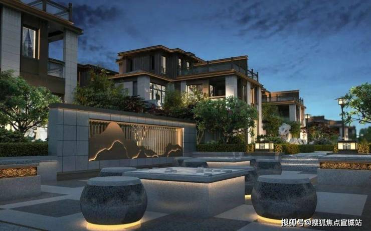约3500㎡的中央景观区,融汇山池、六角亭、戏台、石舫,实现一步异景的院落诗意居境.