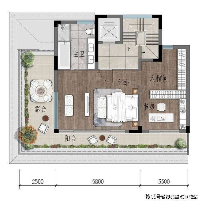 三层,一整层独立空间,主卧、主卫、衣帽间、书房,四位一体。